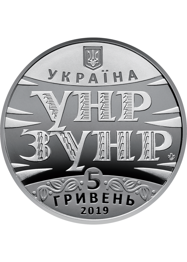 underneath, against a matte backdrop is the coin`s face value 5/ГРИВЕНЬ (5 hryvnias), on either side of which is a conventionalized floral