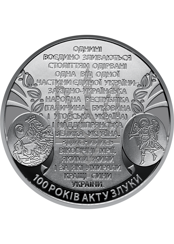 ornament in the form of laurel branches; underneath is the inscription 100 РОКІВ АКТУ ЗЛУКИ (100 years of the