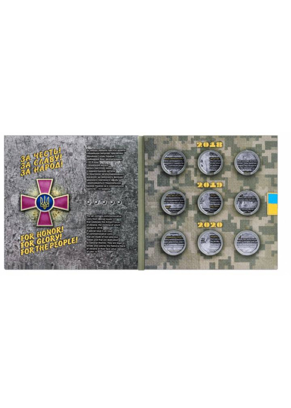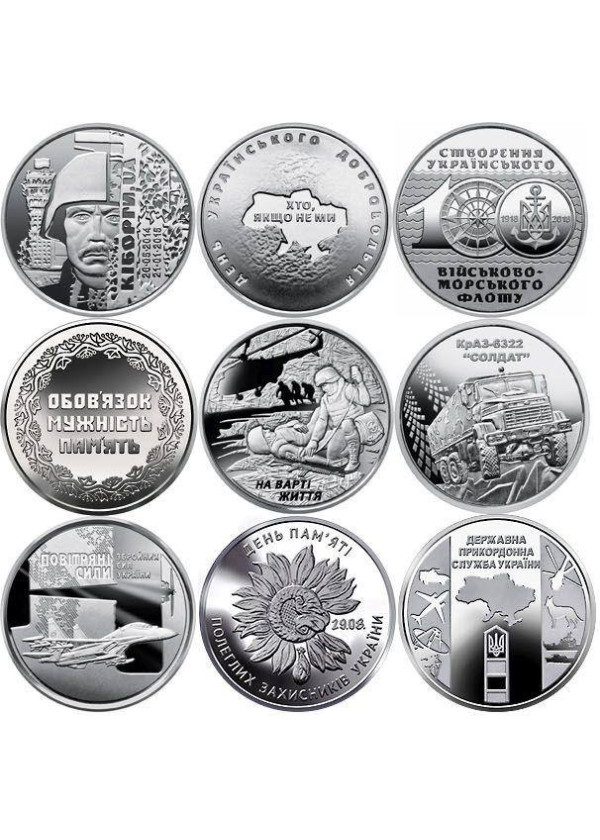 A set of nine commemorative coins of special issues of the "Armed Forces of Ukraine" series 2018-2020
