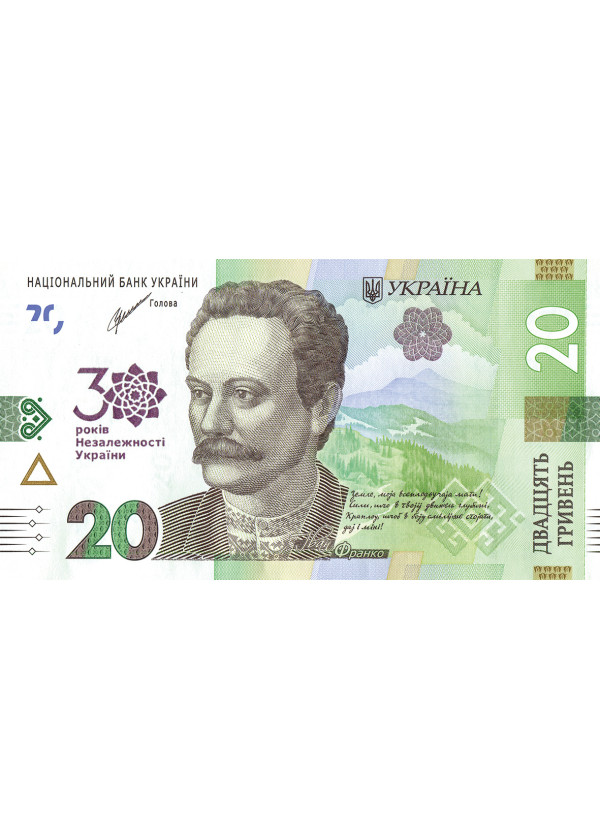 A commemorative banknote with a face value of 20 hryvnias in 2018, signed by the Chairman of the National Bank of Ukraine, has been put into circulation for the 30th anniversary of Ukraine’s independence. The commemorative banknote contains all the elements of protection of the 20 hryvnia banknote of the 2018 model with additional application on the obverse, in place of the watermark, screen printing with OVMI ink identity - "30 years of Independence of Ukraine"; the size of the banknote is 69 x 130 mm.