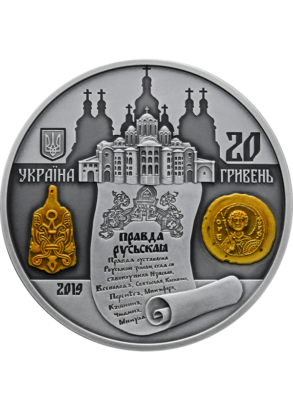 Obverse: above, to the left, is Ukraine`s small coat of arms, below which is the legend УКРАЇНА (Ukraine); to the right is the coin’s face value 20/ГРИВЕНЬ (20/hryvnias); against the backdrop of the outlines of the domes of St. Sofia’s Cathedral is an image of a reconstruction of the 11th century cathedral, below which is a stylized roll of Ruska Pravda (the legal code of Kyiv Rus); on both sides of the roll are gilt* images of Yaroslav the Wise’s heraldic sign (to the left) and stamp (to the right); beneath, to the left, is the coin issue year 2019.