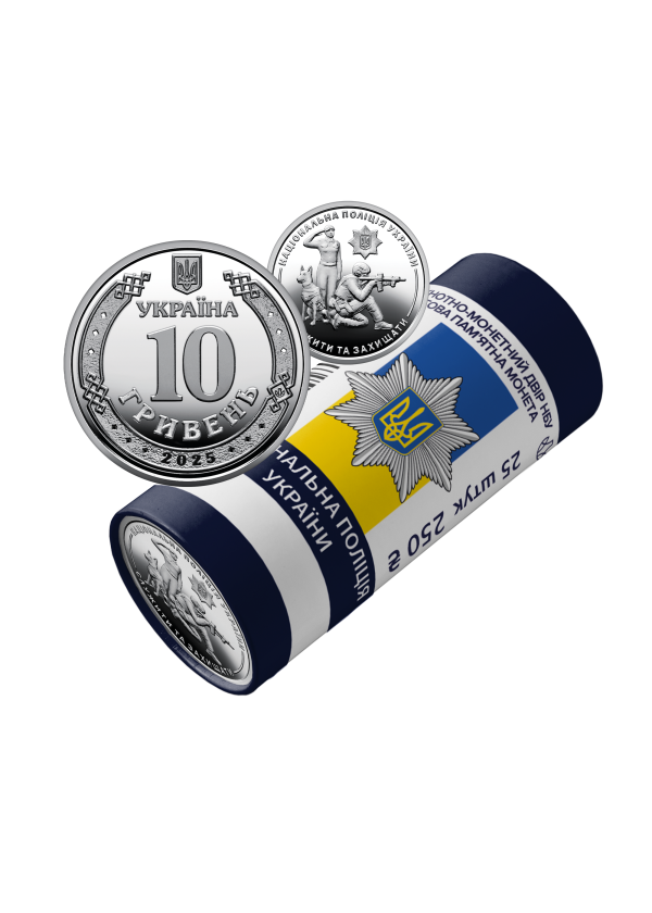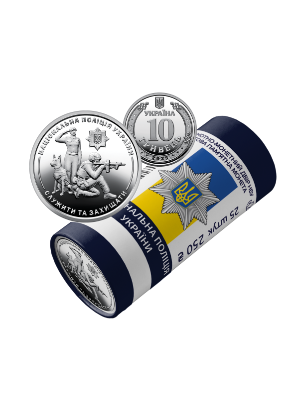 Tags: National Police of Ukraine, 2025 commemorative coin, 10 Hryvnia coin, roll of 25 coins, Ukrainian circulation coin, National Bank of Ukraine, Ukrainian numismatics, uncirculated coin, modern Ukrainian coin, police commemorative coin, collectible coin roll, Ukraine 2025 coin release