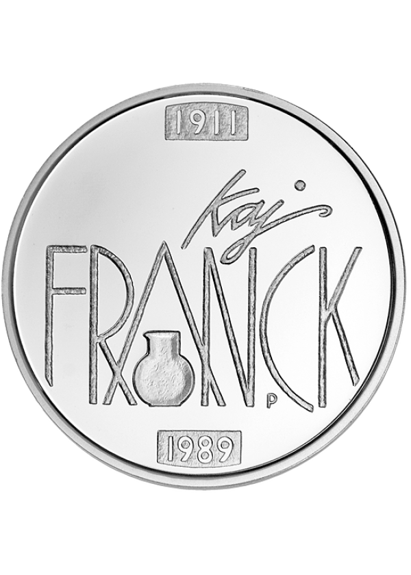 The simplified profiles on the reverse side portray the most famous forms of Kaj Franck’s production. The obverse side depicts the signature of Kaj Franck in the same simple spirit.