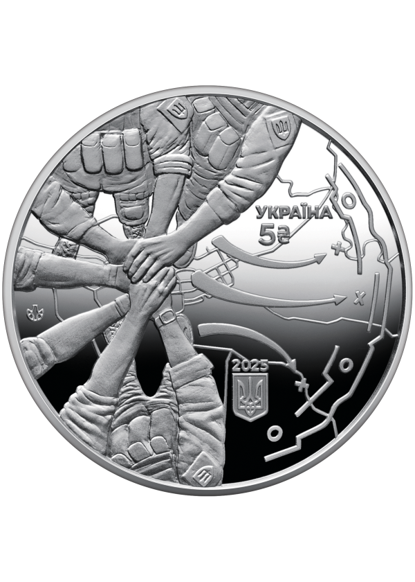 At the heart of the design is a circle of Ukrainian defenders, linking hands in a symbolic gesture of unity and readiness. Behind them lies a schematic topographic map of Ukraine’s battle zones, featuring marked lines of defense that subtly form a trident—Ukraine’s national symbol. The composition is surrounded by key inscriptions including УКРАЇНА (Ukraine), the coin’s denomination 5₴, the year 2025, and the national coat of arms.