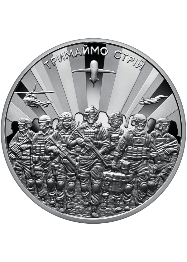 The reverse captures a bold forward march—Ukrainian soldiers advancing with resolve. Above them, military aircraft, helicopters, and drones soar overhead, symbolizing the power and resilience of Ukraine’s armed forces. In the background, the silhouettes of civilians—representing the home front—stand firm in solidarity, reminding us of the collective effort behind every victory. The inscription ТРИМАЙМО СТРІЙ (Let’s Hold the Line) crowns the top of the coin.