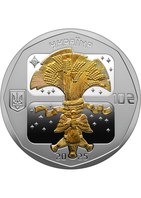 The obverse features a stylised didukh, a ceremonial wheat sheaf associated with Christmas Eve (Sviatyi Vechir), enhanced with selective gilding. A straw angel at the base symbolises protection and the Good News, while a diamond-shaped star represents the Star of Bethlehem. Design elements also include the legend “UKRAINE”, the issue year 2025, the Small State Coat of Arms of Ukraine, and the face value of 10 hryvnias.