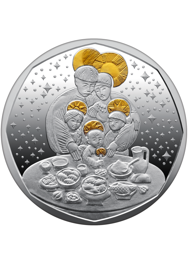 The reverse depicts a traditional Ukrainian Christmas Eve family meal with twelve ritual dishes. Family figures are symbolically associated with celestial bodies (the Sun, Moon, and stars) highlighted with selective gilding. The composition reflects warmth, continuity, and the preservation of generational traditions.