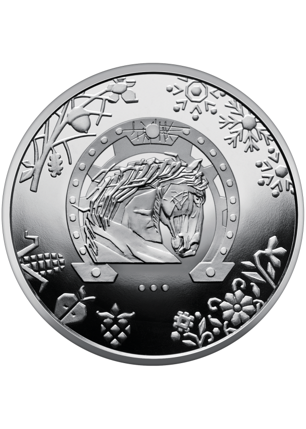 The obverse presents the 12 zodiac animals, arranged around a mirror-polished centre with a pointed clock hand marking 2026 — the Year of the Horse. Traditional vytynanka motifs of all four seasons — snowflake, flower, berry, and leaf — celebrate the continuity of time and life.