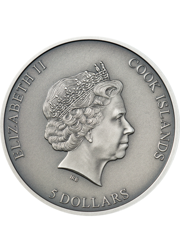 This extraordinary 1 oz .999 silver coin measures 26mm in diameter and is struck in an antique finish. Mintage is limited to only 2500 pieces.